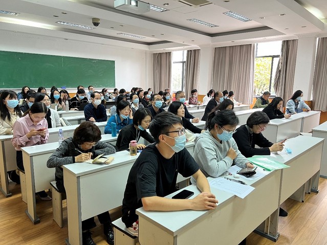 肖维青教授从“初心使命”、《高等学校课程思政建设指导纲要》对外语类专业人才培养提出的新要求、新目标入手,阐释了外语类专业课程思政的内涵。同时,肖教授以自己担任的《中外翻译史》等多门课程为例,结合课程实践阐述了翻译专业课程思政的内涵与建设路径。随后,肖教授提出了“思政课程课程链”的概念。即围绕特定主题,传授特定知识,培养员工特定能力设立的一组课程。课程是“点”,“课程链”是“线”,课程体系是“面”。老师们要创新方式方法,强调内容融合,形成点、线、面贯通的立体化课程思政体系,才能做好有温度、有深度、有高度的课程思政。讲座后,肖维青教授还详细回答了老师们的提问,和老师们进行了深入的交流。