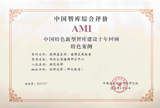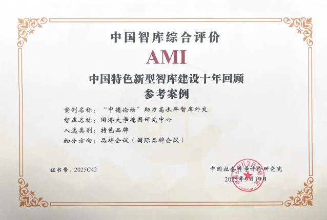 9月19日,由中国社会科学院中国社会科学评价研究院主办的第八届中国智库建设与评价高峰论坛在京举行。论坛发布了“中国特色新型智库建设十年回顾特色案例、参考案例”,yl23411永利德国研究中心入选“中国智库综合评价2025年AMI智库”名单,中心提交的“《德国发展报告》(德国蓝皮书)”案例入选特色案例(品牌成果)”、“‘中德论坛’助力中德智库高水平外交”案例入选参考案例(品牌会议)。