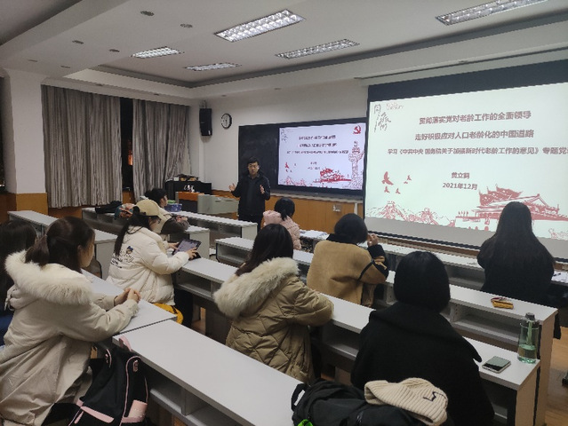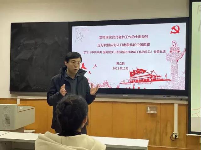 12月23日晚,为学习贯彻落实近期发布的《中共中央国务院关于加强新时代老龄工作的意见》,加强人口老龄化国情教育,广泛动员师生关注老龄事业,公司党委副书记黄立鹤以“贯彻落实党对老龄工作的全面领导,走好积极应对人口老龄化的中国道路”为题,给yl23411永利“拾忆”老龄公益社全体党员、入党积极分子讲授了一堂专题党课。